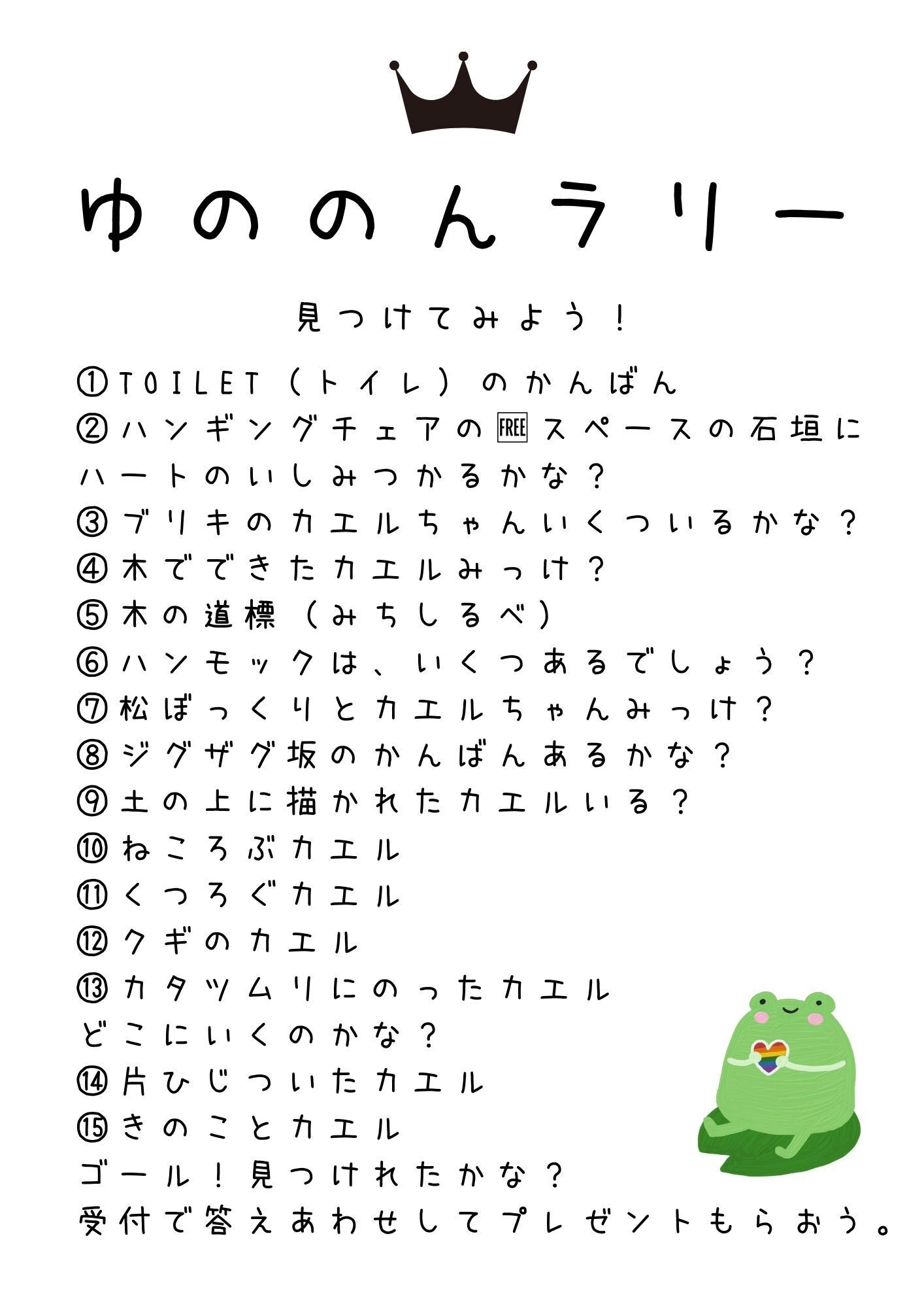 GW明けの週末!2024年05月11日 10:115月11日(土)10時のゆののん 気温18度 良い天気爽やかな風が通る森でのんびりしませんか代表のりかちゃん、本日から復帰♪ゆののんマスター、N.Yoshidaさん本日登場予定♪(ゆののん内で作業をしています…お声がけお願いします♪)ゆののんでは、お子様向けに(大人でもOK)「ゆののんラリー」を用意していますあなたが「これだ!」と感じたものが正解です♪時間があったらお試しください寒暖差が古城祭り