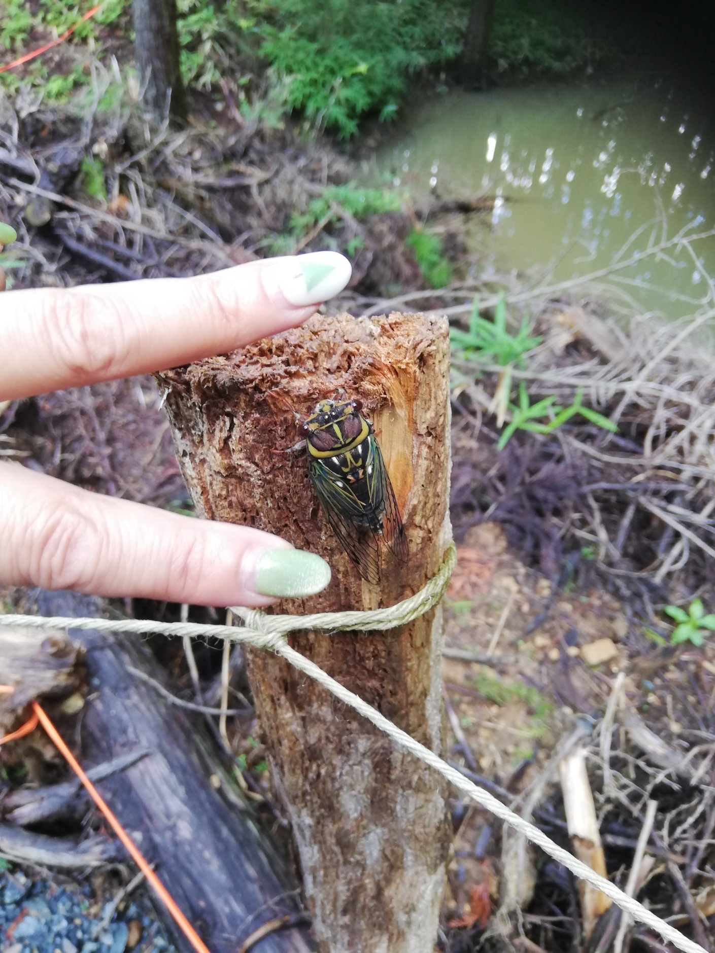 池のほとりに見慣れないセミが