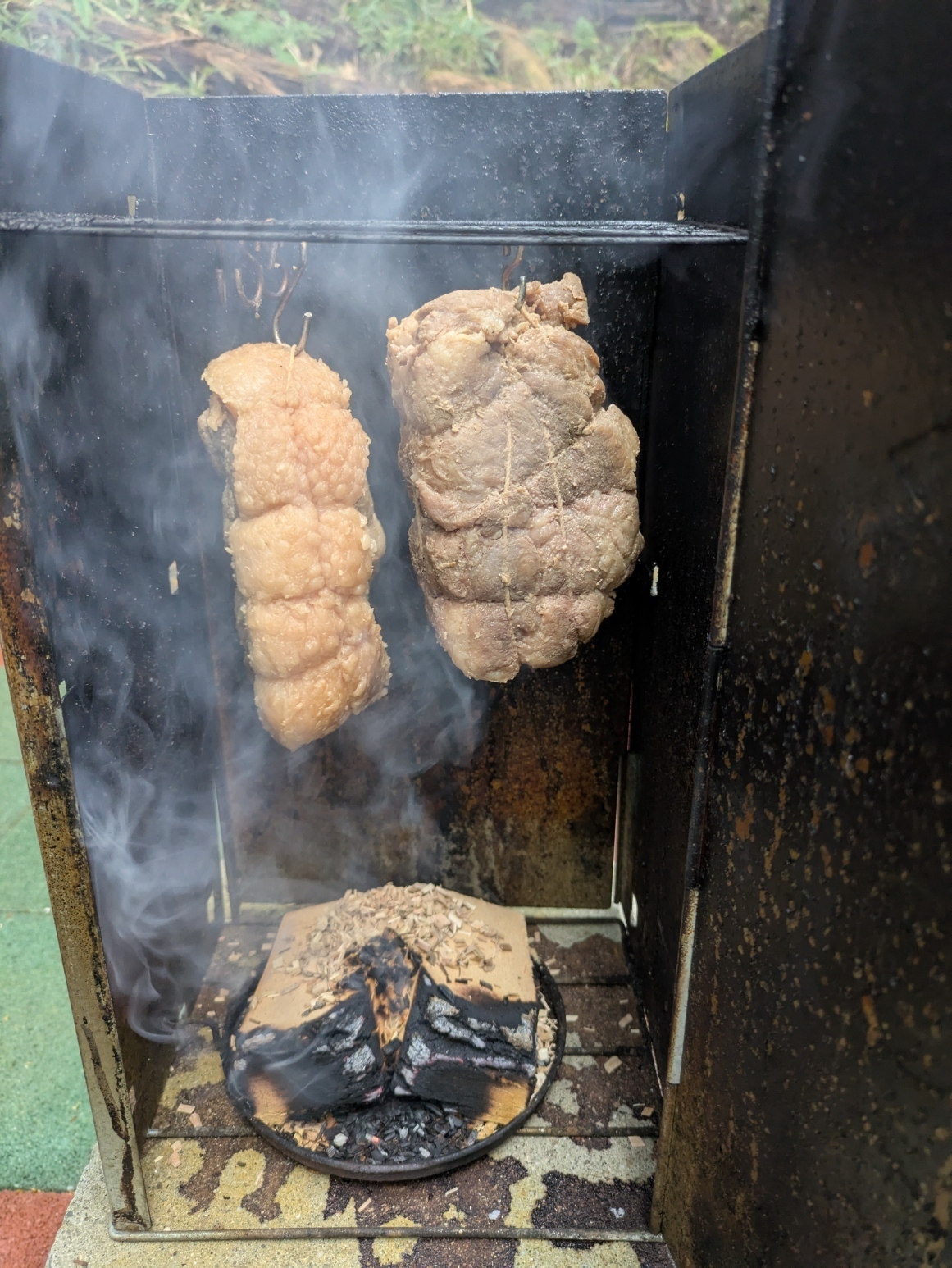 燻製イベント!2024年11月16日 10:1611月16日(土)10時のゆののん 気温16℃ 湿度75% 曇り夕方から雨の予報です本日、豚肉塊燻製体験イベント(なんちゅーネーミング (^-^;事前予約制なので、当日参加はごめんなさいです1週間前から仕込んだ豚肉塊をすでに燻製器にセットあとは仕上がるのを待つだけ♪雨上がりの森の中爽やかな朝です♪